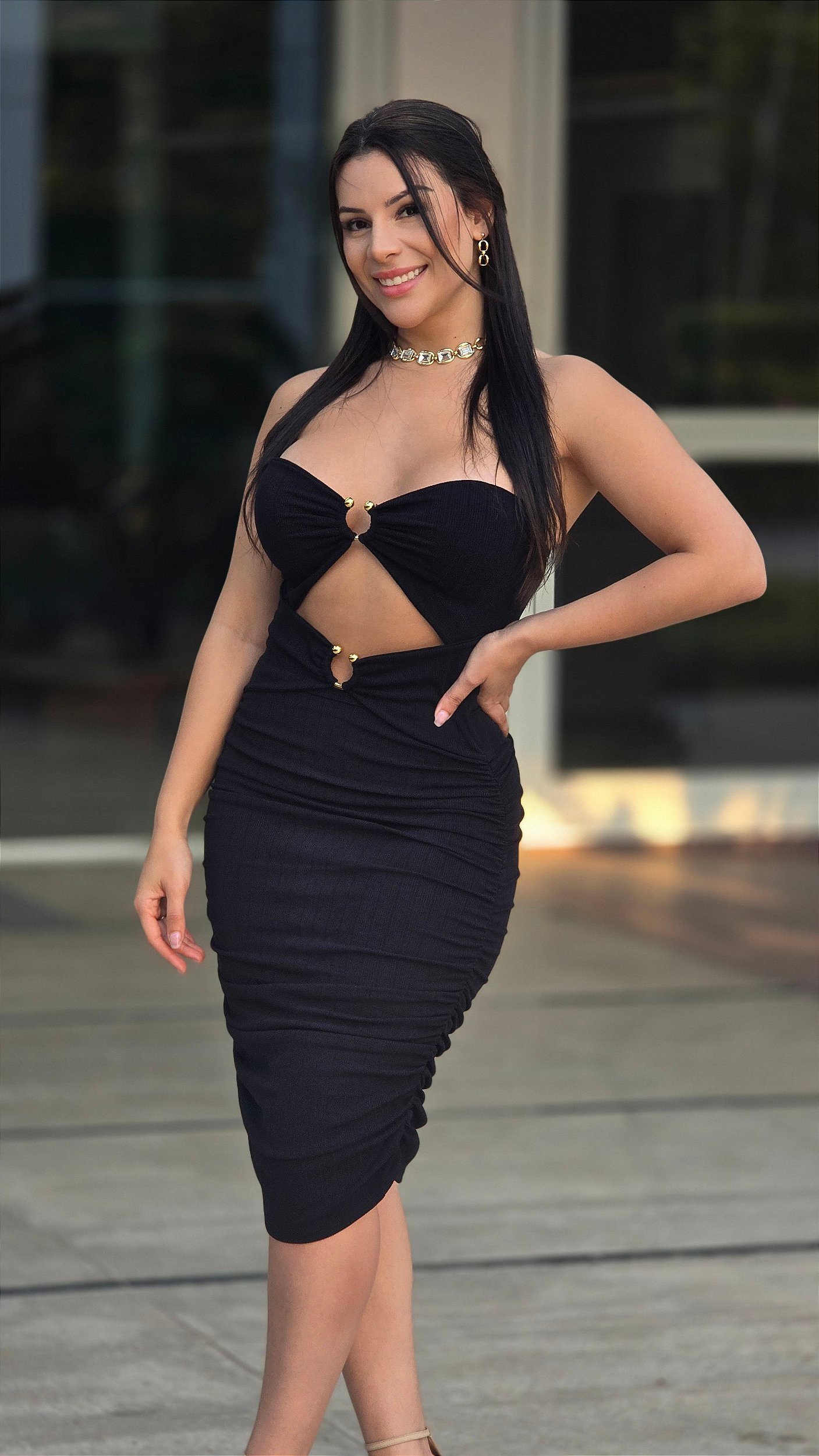 Elegante, moderno e cheio de atitude, este vestido midi preto é a escolha certa para quem deseja um look marcante. O modelo traz recortes estratégicos na cintura que valorizam a silhueta, além de detalhes em metais dourados que adicionam sofisticação na medida certa.